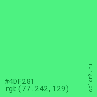 Цвет #4DF281 в цветовой модели RGB обозначается тремя октетами (77, 242, 129) в десятичном формате и #4DF281 в шестнадцатиричном (hex) формате, которые являются интенсивностью красного 77 (hex 4D), интенсивность зелёного 242 (hex F2) и интенсивность синего 129 (hex 81).