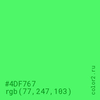 Цвет #4DF767 в цветовой модели RGB обозначается тремя октетами (77, 247, 103) в десятичном формате и #4DF767 в шестнадцатиричном (hex) формате, которые являются интенсивностью красного 77 (hex 4D), интенсивность зелёного 247 (hex F7) и интенсивность синего 103 (hex 67).