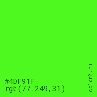 Цвет #4DF91F в цветовой модели RGB обозначается тремя октетами (77, 249, 31) в десятичном формате и #4DF91F в шестнадцатиричном (hex) формате, которые являются интенсивностью красного 77 (hex 4D), интенсивность зелёного 249 (hex F9) и интенсивность синего 31 (hex 1F).