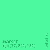 Цвет #4DF99F в цветовой модели RGB обозначается тремя октетами (77, 249, 159) в десятичном формате и #4DF99F в шестнадцатиричном (hex) формате, которые являются интенсивностью красного 77 (hex 4D), интенсивность зелёного 249 (hex F9) и интенсивность синего 159 (hex 9F).
