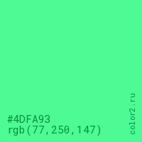 Цвет #4DFA93 в цветовой модели RGB обозначается тремя октетами (77, 250, 147) в десятичном формате и #4DFA93 в шестнадцатиричном (hex) формате, которые являются интенсивностью красного 77 (hex 4D), интенсивность зелёного 250 (hex FA) и интенсивность синего 147 (hex 93).