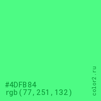 Цвет #4DFB84 в цветовой модели RGB обозначается тремя октетами (77, 251, 132) в десятичном формате и #4DFB84 в шестнадцатиричном (hex) формате, которые являются интенсивностью красного 77 (hex 4D), интенсивность зелёного 251 (hex FB) и интенсивность синего 132 (hex 84).