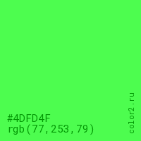 Цвет #4DFD4F в цветовой модели RGB обозначается тремя октетами (77, 253, 79) в десятичном формате и #4DFD4F в шестнадцатиричном (hex) формате, которые являются интенсивностью красного 77 (hex 4D), интенсивность зелёного 253 (hex FD) и интенсивность синего 79 (hex 4F).