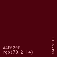 Цвет #4E020E в цветовой модели RGB обозначается тремя октетами (78, 2, 14) в десятичном формате и #4E020E в шестнадцатиричном (hex) формате, которые являются интенсивностью красного 78 (hex 4E), интенсивность зелёного 2 (hex 02) и интенсивность синего 14 (hex 0E).