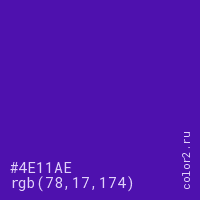 Цвет #4E11AE в цветовой модели RGB обозначается тремя октетами (78, 17, 174) в десятичном формате и #4E11AE в шестнадцатиричном (hex) формате, которые являются интенсивностью красного 78 (hex 4E), интенсивность зелёного 17 (hex 11) и интенсивность синего 174 (hex AE).