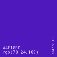 Цвет #4E18BD в цветовой модели RGB обозначается тремя октетами (78, 24, 189) в десятичном формате и #4E18BD в шестнадцатиричном (hex) формате, которые являются интенсивностью красного 78 (hex 4E), интенсивность зелёного 24 (hex 18) и интенсивность синего 189 (hex BD).