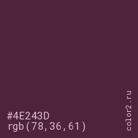 Цвет #4E243D в цветовой модели RGB обозначается тремя октетами (78, 36, 61) в десятичном формате и #4E243D в шестнадцатиричном (hex) формате, которые являются интенсивностью красного 78 (hex 4E), интенсивность зелёного 36 (hex 24) и интенсивность синего 61 (hex 3D).