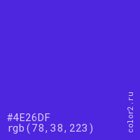 Цвет #4E26DF в цветовой модели RGB обозначается тремя октетами (78, 38, 223) в десятичном формате и #4E26DF в шестнадцатиричном (hex) формате, которые являются интенсивностью красного 78 (hex 4E), интенсивность зелёного 38 (hex 26) и интенсивность синего 223 (hex DF).