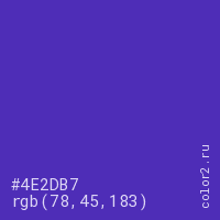 Цвет #4E2DB7 в цветовой модели RGB обозначается тремя октетами (78, 45, 183) в десятичном формате и #4E2DB7 в шестнадцатиричном (hex) формате, которые являются интенсивностью красного 78 (hex 4E), интенсивность зелёного 45 (hex 2D) и интенсивность синего 183 (hex B7).
