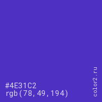 Цвет #4E31C2 в цветовой модели RGB обозначается тремя октетами (78, 49, 194) в десятичном формате и #4E31C2 в шестнадцатиричном (hex) формате, которые являются интенсивностью красного 78 (hex 4E), интенсивность зелёного 49 (hex 31) и интенсивность синего 194 (hex C2).
