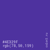 Цвет #4E329F в цветовой модели RGB обозначается тремя октетами (78, 50, 159) в десятичном формате и #4E329F в шестнадцатиричном (hex) формате, которые являются интенсивностью красного 78 (hex 4E), интенсивность зелёного 50 (hex 32) и интенсивность синего 159 (hex 9F).