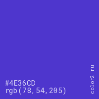 Цвет #4E36CD в цветовой модели RGB обозначается тремя октетами (78, 54, 205) в десятичном формате и #4E36CD в шестнадцатиричном (hex) формате, которые являются интенсивностью красного 78 (hex 4E), интенсивность зелёного 54 (hex 36) и интенсивность синего 205 (hex CD).
