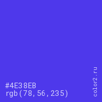 Цвет #4E38EB в цветовой модели RGB обозначается тремя октетами (78, 56, 235) в десятичном формате и #4E38EB в шестнадцатиричном (hex) формате, которые являются интенсивностью красного 78 (hex 4E), интенсивность зелёного 56 (hex 38) и интенсивность синего 235 (hex EB).