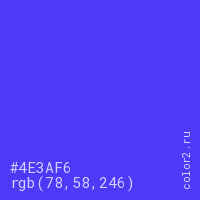 Цвет #4E3AF6 в цветовой модели RGB обозначается тремя октетами (78, 58, 246) в десятичном формате и #4E3AF6 в шестнадцатиричном (hex) формате, которые являются интенсивностью красного 78 (hex 4E), интенсивность зелёного 58 (hex 3A) и интенсивность синего 246 (hex F6).