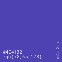 Цвет #4E41B2 в цветовой модели RGB обозначается тремя октетами (78, 65, 178) в десятичном формате и #4E41B2 в шестнадцатиричном (hex) формате, которые являются интенсивностью красного 78 (hex 4E), интенсивность зелёного 65 (hex 41) и интенсивность синего 178 (hex B2).