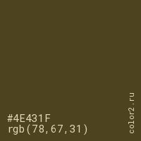 Цвет #4E431F в цветовой модели RGB обозначается тремя октетами (78, 67, 31) в десятичном формате и #4E431F в шестнадцатиричном (hex) формате, которые являются интенсивностью красного 78 (hex 4E), интенсивность зелёного 67 (hex 43) и интенсивность синего 31 (hex 1F).