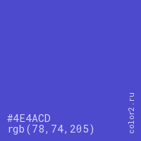 Цвет #4E4ACD в цветовой модели RGB обозначается тремя октетами (78, 74, 205) в десятичном формате и #4E4ACD в шестнадцатиричном (hex) формате, которые являются интенсивностью красного 78 (hex 4E), интенсивность зелёного 74 (hex 4A) и интенсивность синего 205 (hex CD).