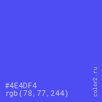 Цвет #4E4DF4 в цветовой модели RGB обозначается тремя октетами (78, 77, 244) в десятичном формате и #4E4DF4 в шестнадцатиричном (hex) формате, которые являются интенсивностью красного 78 (hex 4E), интенсивность зелёного 77 (hex 4D) и интенсивность синего 244 (hex F4).