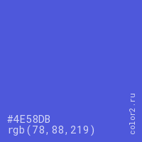 Цвет #4E58DB в цветовой модели RGB обозначается тремя октетами (78, 88, 219) в десятичном формате и #4E58DB в шестнадцатиричном (hex) формате, которые являются интенсивностью красного 78 (hex 4E), интенсивность зелёного 88 (hex 58) и интенсивность синего 219 (hex DB).