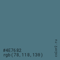 Цвет #4E7682 в цветовой модели RGB обозначается тремя октетами (78, 118, 130) в десятичном формате и #4E7682 в шестнадцатиричном (hex) формате, которые являются интенсивностью красного 78 (hex 4E), интенсивность зелёного 118 (hex 76) и интенсивность синего 130 (hex 82).