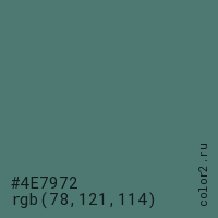 Цвет #4E7972 в цветовой модели RGB обозначается тремя октетами (78, 121, 114) в десятичном формате и #4E7972 в шестнадцатиричном (hex) формате, которые являются интенсивностью красного 78 (hex 4E), интенсивность зелёного 121 (hex 79) и интенсивность синего 114 (hex 72).