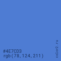 Цвет #4E7CD3 в цветовой модели RGB обозначается тремя октетами (78, 124, 211) в десятичном формате и #4E7CD3 в шестнадцатиричном (hex) формате, которые являются интенсивностью красного 78 (hex 4E), интенсивность зелёного 124 (hex 7C) и интенсивность синего 211 (hex D3).