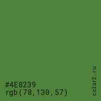 Цвет #4E8239 в цветовой модели RGB обозначается тремя октетами (78, 130, 57) в десятичном формате и #4E8239 в шестнадцатиричном (hex) формате, которые являются интенсивностью красного 78 (hex 4E), интенсивность зелёного 130 (hex 82) и интенсивность синего 57 (hex 39).