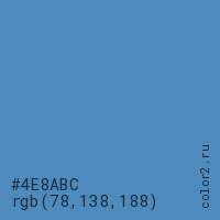Цвет #4E8ABC в цветовой модели RGB обозначается тремя октетами (78, 138, 188) в десятичном формате и #4E8ABC в шестнадцатиричном (hex) формате, которые являются интенсивностью красного 78 (hex 4E), интенсивность зелёного 138 (hex 8A) и интенсивность синего 188 (hex BC).
