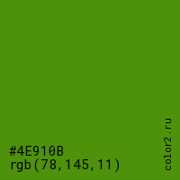 Цвет #4E910B в цветовой модели RGB обозначается тремя октетами (78, 145, 11) в десятичном формате и #4E910B в шестнадцатиричном (hex) формате, которые являются интенсивностью красного 78 (hex 4E), интенсивность зелёного 145 (hex 91) и интенсивность синего 11 (hex 0B).
