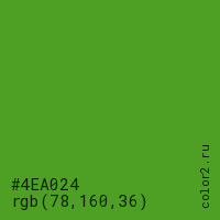 Цвет #4EA024 в цветовой модели RGB обозначается тремя октетами (78, 160, 36) в десятичном формате и #4EA024 в шестнадцатиричном (hex) формате, которые являются интенсивностью красного 78 (hex 4E), интенсивность зелёного 160 (hex A0) и интенсивность синего 36 (hex 24).
