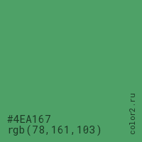 Цвет #4EA167 в цветовой модели RGB обозначается тремя октетами (78, 161, 103) в десятичном формате и #4EA167 в шестнадцатиричном (hex) формате, которые являются интенсивностью красного 78 (hex 4E), интенсивность зелёного 161 (hex A1) и интенсивность синего 103 (hex 67).