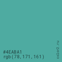 Цвет #4EABA1 в цветовой модели RGB обозначается тремя октетами (78, 171, 161) в десятичном формате и #4EABA1 в шестнадцатиричном (hex) формате, которые являются интенсивностью красного 78 (hex 4E), интенсивность зелёного 171 (hex AB) и интенсивность синего 161 (hex A1).