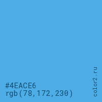 Цвет #4EACE6 в цветовой модели RGB обозначается тремя октетами (78, 172, 230) в десятичном формате и #4EACE6 в шестнадцатиричном (hex) формате, которые являются интенсивностью красного 78 (hex 4E), интенсивность зелёного 172 (hex AC) и интенсивность синего 230 (hex E6).