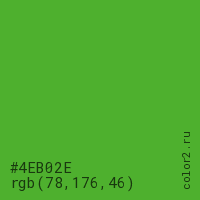 Цвет #4EB02E в цветовой модели RGB обозначается тремя октетами (78, 176, 46) в десятичном формате и #4EB02E в шестнадцатиричном (hex) формате, которые являются интенсивностью красного 78 (hex 4E), интенсивность зелёного 176 (hex B0) и интенсивность синего 46 (hex 2E).