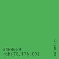 Цвет #4EB059 в цветовой модели RGB обозначается тремя октетами (78, 176, 89) в десятичном формате и #4EB059 в шестнадцатиричном (hex) формате, которые являются интенсивностью красного 78 (hex 4E), интенсивность зелёного 176 (hex B0) и интенсивность синего 89 (hex 59).