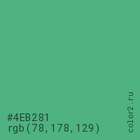 Цвет #4EB281 в цветовой модели RGB обозначается тремя октетами (78, 178, 129) в десятичном формате и #4EB281 в шестнадцатиричном (hex) формате, которые являются интенсивностью красного 78 (hex 4E), интенсивность зелёного 178 (hex B2) и интенсивность синего 129 (hex 81).