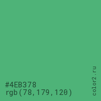 Цвет #4EB378 в цветовой модели RGB обозначается тремя октетами (78, 179, 120) в десятичном формате и #4EB378 в шестнадцатиричном (hex) формате, которые являются интенсивностью красного 78 (hex 4E), интенсивность зелёного 179 (hex B3) и интенсивность синего 120 (hex 78).