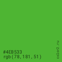 Цвет #4EB533 в цветовой модели RGB обозначается тремя октетами (78, 181, 51) в десятичном формате и #4EB533 в шестнадцатиричном (hex) формате, которые являются интенсивностью красного 78 (hex 4E), интенсивность зелёного 181 (hex B5) и интенсивность синего 51 (hex 33).