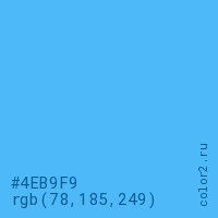 Цвет #4EB9F9 в цветовой модели RGB обозначается тремя октетами (78, 185, 249) в десятичном формате и #4EB9F9 в шестнадцатиричном (hex) формате, которые являются интенсивностью красного 78 (hex 4E), интенсивность зелёного 185 (hex B9) и интенсивность синего 249 (hex F9).