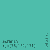 Цвет #4EBDAB в цветовой модели RGB обозначается тремя октетами (78, 189, 171) в десятичном формате и #4EBDAB в шестнадцатиричном (hex) формате, которые являются интенсивностью красного 78 (hex 4E), интенсивность зелёного 189 (hex BD) и интенсивность синего 171 (hex AB).