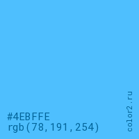 Цвет #4EBFFE в цветовой модели RGB обозначается тремя октетами (78, 191, 254) в десятичном формате и #4EBFFE в шестнадцатиричном (hex) формате, которые являются интенсивностью красного 78 (hex 4E), интенсивность зелёного 191 (hex BF) и интенсивность синего 254 (hex FE).