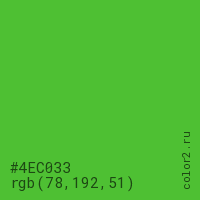 Цвет #4EC033 в цветовой модели RGB обозначается тремя октетами (78, 192, 51) в десятичном формате и #4EC033 в шестнадцатиричном (hex) формате, которые являются интенсивностью красного 78 (hex 4E), интенсивность зелёного 192 (hex C0) и интенсивность синего 51 (hex 33).