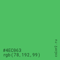 Цвет #4EC063 в цветовой модели RGB обозначается тремя октетами (78, 192, 99) в десятичном формате и #4EC063 в шестнадцатиричном (hex) формате, которые являются интенсивностью красного 78 (hex 4E), интенсивность зелёного 192 (hex C0) и интенсивность синего 99 (hex 63).