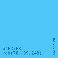 Цвет #4EC7F8 в цветовой модели RGB обозначается тремя октетами (78, 199, 248) в десятичном формате и #4EC7F8 в шестнадцатиричном (hex) формате, которые являются интенсивностью красного 78 (hex 4E), интенсивность зелёного 199 (hex C7) и интенсивность синего 248 (hex F8).