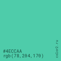 Цвет #4ECCAA в цветовой модели RGB обозначается тремя октетами (78, 204, 170) в десятичном формате и #4ECCAA в шестнадцатиричном (hex) формате, которые являются интенсивностью красного 78 (hex 4E), интенсивность зелёного 204 (hex CC) и интенсивность синего 170 (hex AA).