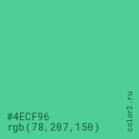 Цвет #4ECF96 в цветовой модели RGB обозначается тремя октетами (78, 207, 150) в десятичном формате и #4ECF96 в шестнадцатиричном (hex) формате, которые являются интенсивностью красного 78 (hex 4E), интенсивность зелёного 207 (hex CF) и интенсивность синего 150 (hex 96).