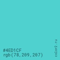 Цвет #4ED1CF в цветовой модели RGB обозначается тремя октетами (78, 209, 207) в десятичном формате и #4ED1CF в шестнадцатиричном (hex) формате, которые являются интенсивностью красного 78 (hex 4E), интенсивность зелёного 209 (hex D1) и интенсивность синего 207 (hex CF).