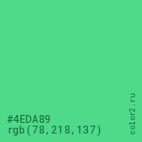 Цвет #4EDA89 в цветовой модели RGB обозначается тремя октетами (78, 218, 137) в десятичном формате и #4EDA89 в шестнадцатиричном (hex) формате, которые являются интенсивностью красного 78 (hex 4E), интенсивность зелёного 218 (hex DA) и интенсивность синего 137 (hex 89).