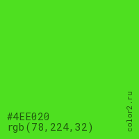Цвет #4EE020 в цветовой модели RGB обозначается тремя октетами (78, 224, 32) в десятичном формате и #4EE020 в шестнадцатиричном (hex) формате, которые являются интенсивностью красного 78 (hex 4E), интенсивность зелёного 224 (hex E0) и интенсивность синего 32 (hex 20).