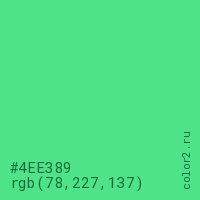 Цвет #4EE389 в цветовой модели RGB обозначается тремя октетами (78, 227, 137) в десятичном формате и #4EE389 в шестнадцатиричном (hex) формате, которые являются интенсивностью красного 78 (hex 4E), интенсивность зелёного 227 (hex E3) и интенсивность синего 137 (hex 89).